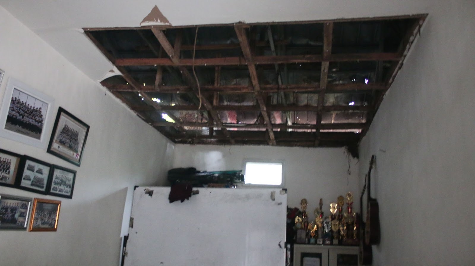 “Kalo plafonnya ambruk sebenernya udah lumayan lama sih, dari awal kepengurusan tahun ini lah, sebenarnya sudah ambruk, tapi ga semuanya, awalnya kayak bocor kecil terus akhirnya ambruk,” ujarnya saat diwawancarai secara langsung, Rabu (24/12/2025).