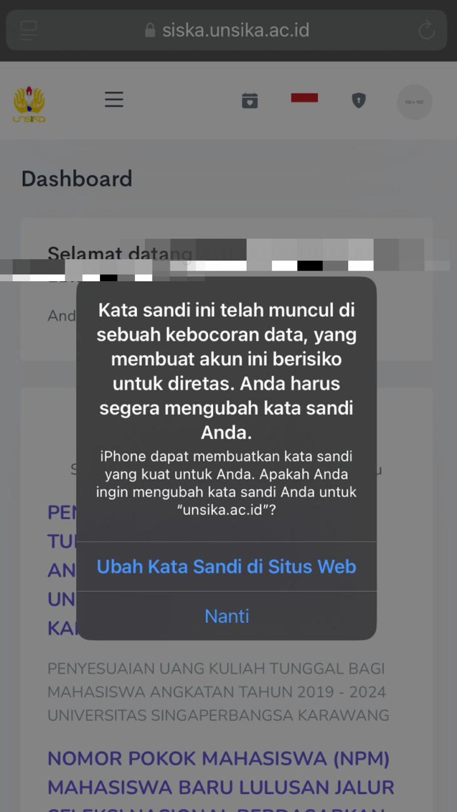 Jajam menjelaskan bahwa gambar bertuliskan, “Kata sandi ini telah muncul di sebuah kebocoran data, Anda harus segera mengubah kata sandi Anda” berkaitan langsung dengan Siska karena tampilan latarnya adalah Siska. Ia menyampaikan bahwa peringatan tersebut sebenarnya merupakan bagian dari sistem pengamanan yang berasal dari perangkat (device) dan digunakan mahasiswa. Menurutnya, perangkat tersebut mendeteksi bahwa password yang digunakan di Siska tergolong lemah, sehingga muncul rekomendasi agar pengguna segera menggantinya.